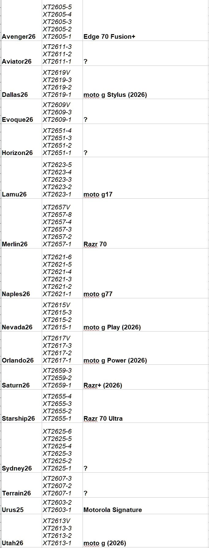 Since motorola operates under Lenovo, the appearance of internal references across Lenovo’s ecosystem is not entirely surprising. Blass organized the data into a table, offering a clearer snapshot of what motorola may have in store for the coming year.